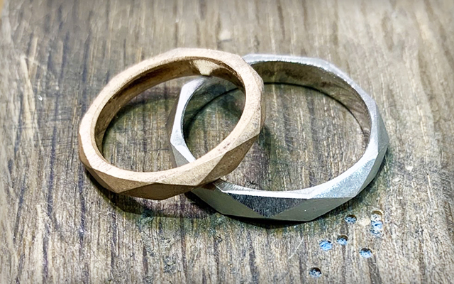 デザインによって鍛造(地金加工)とワックス(原型)の二つより最適な方法を選択します。オーダーを頂いたら、型を使わず全て一から製作致しますので一生に一つの宝物になります。
